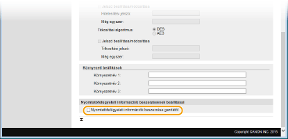 A Kijelölt logikai csoport egy előre beállított csoport, amely kizárólag a Canon szoftvert (például iW Management Console) használó rendszergazdáknak szántak. Válassza ki a jelölőnégyzetet, és adja meg a következőt: [MIB hozzáférési engedély] Kijelölt logikai csoport használatához. Ha nem kell használni a Kijelölt logikai csoportot, akkor törölje a jelölőnégyzetet.