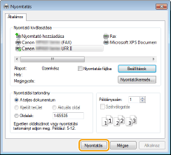 Érintse meg vagy kattintson rá: [Eszközök] [Nyomtatás] a készülék nyomtató-illesztőprogramja [Nyomtatás].Ha ezzel a módszerrel nyomtat, csak korlátozott számú nyomtatási beállítás érhető el.