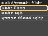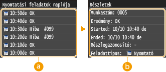 ![]() <Nyomtatási feladatok naplója>A nyomtatott dokumentumok listáját jeleníti meg. Ha a dokumentum nyomtatása sikeres volt, akkor az <OK> felirat jelenik meg, ha viszont megszakítás vagy valamilyen hiba miatt sikertelen volt, akkor a <Hiba> jelzés látható.