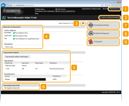 Megjeleníti a készülék aktuális állapotát és a hibainformációkat. Ha hiba történt, akkor megjelenik a Hibainformációk oldalra mutató hivatkozás.