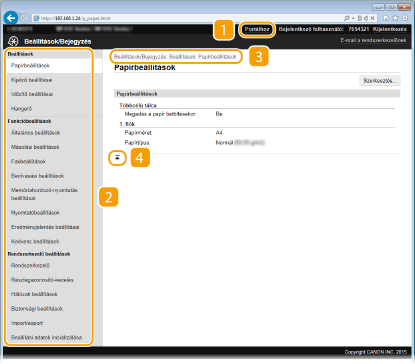 megjeleníti a [Beállítások/Bejegyzés] oldalt. Ha rendszerkezelő módban jelentkezett be, akkor módosíthatja a beállításokat, illetve mentheti/betöltheti a bejegyzett adatokat.