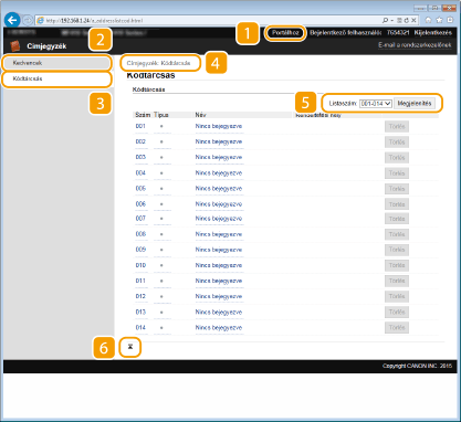 Megjeleníti a hívókódokat és a címjegyzékbe bejegyzett Kedvencek listát. A címjegyzékbe akkor készíthet bejegyzést, illetve szerkesztheti a meglévőket, ha rendszerkezelői módban jelentkezett be.