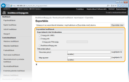 Válassza ki az exportálandó beállításokat, és állítsa be a titkosítási jelszót.
