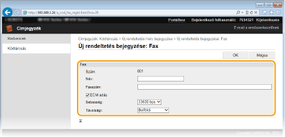 Az [ECM adás] és a [Sebesség] beállítást is megadhatja a <Faxbeállítások> ( Faxbeállítások (MF515x)) menüből, amely a kezelőpanelről érhető el. Azonban a <Címjegyzék> elemből megadott beállítások engedélyezve lesznek a Címjegyzékbe bejegyzett címek részletes beállításaihoz.