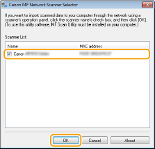 Ha ezt a készüléket lapolvasóként szeretné használni, el kell végeznie néhány előkészületet, beleértve a számítógépre történő szoftvertelepítést is. További információkért lásd: „MF Driver Installation Guide (MF-illesztőprogram-telepítési útmutató)”. Ha a készüléket egy vezeték nélküli vagy vezetékes hálózaton keresztül szeretné a számítógéphez csatlakoztatni, a készüléket be kell jegyeznie az „MF Network Scanner Selector” programban a következő módon. Erre nincs szükség, ha a készülék és a számítógép USB-n keresztül csatlakozik.