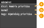 Megadhatja, hogy a beolvasott dokumentumokat a program JPEG formátumba konvertálja, mekkora legyen a tömörítési arány. A <Kicsi: Memória prioritása> magasabb tömörítési arányt eredményez, mint a normál, így kisebb, de rosszabb minőségű fájlokat hoz létre. Másrészt a <Nagy: Képminőség prioritása> alacsonyabb tömörítési arányt eredményez, mint a normál, így nagyobb, de jobb minőségű fájlokat eredményez.