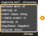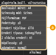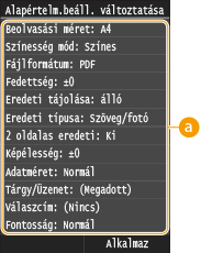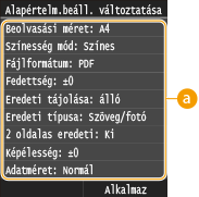 gomb megnyomásakor megjelennek. Ha ezeket az alapértelmezett beállításokat a gyakran használt műveleteknek megfelelően módosítja, azzal kiküszöbölheti az állandó beállítások konfigurálásához szükséges időt az egyes beolvasásoknál.