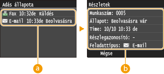 <Részletek>Megjeleníti a listáról kiválasztott dokumentum részletes adatait. Ha több célhelyet adott meg, akkor a képernyőn a megadott célhelyek száma jelenik meg. Több megadott célhely adatainak ellenőrzéséhez érintse meg a <Rendelt. hely> gombot.