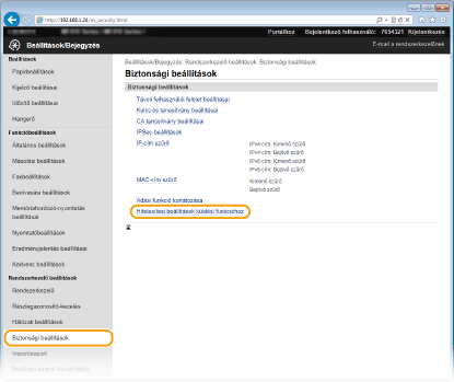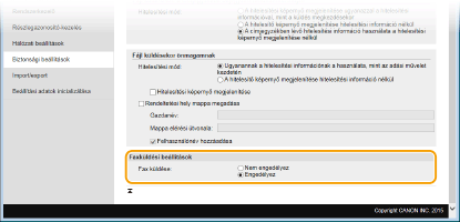 Letiltja a megosztott mappába vagy FTP-kiszolgálóra történő mentést. Ekkor a beolvasási funkciónál nem használható a <Fájl> lehetőség.