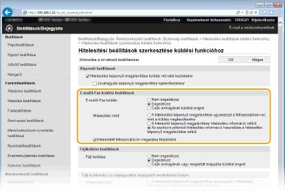 Letiltja az e-mailek és i-faxok küldését, kivéve az engedélyezett e-mail címekkel rendelkező felhasználóknak küldendőket. A jogosult felhasználókat be kell jegyezni az LDAP-kiszolgálón.
