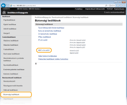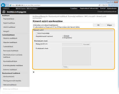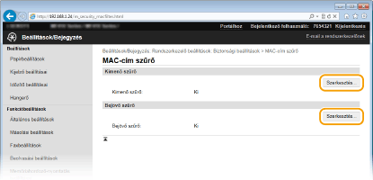 Ha helytelenül adja meg az IP-címeket, akkor előfordulhat, hogy nem fog tudni hozzáférni a készülékhez a Távoli felhasználói felületről, amely esetben a <MAC-cím szűrő> a <Ki> értékre kell állítani. MAC-cím szűrő
