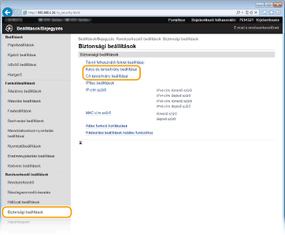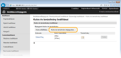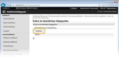 Kattintson a [Kulcs és tanúsítvány beállításai] gombra kulcspár telepítéséhez, vagy a [CA tanúsítvány beállításai] gombra hitelesítésszogláltatói tanúsítvány telepítéséhez.
