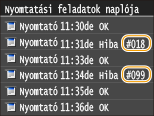 Ha hiba történik (például a nyomtatás sikertelen, vagy nem tud faxot, illetve beolvasott dokumentumot küldeni vagy fogadni), akkor a megfelelő hibakód egy három jegyű szám formájában megjelenik egy hibajelentésben vagy a <Munkanapló> képernyőn. Az egyes hibakódok okát és megoldását a következő részben találja. A hibajelentések nyomtatásával és a jelentésekben található információkkal kapcsolatban lásd: