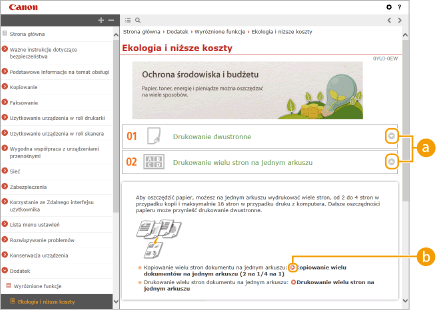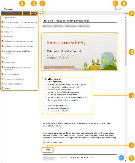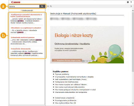 Okno programu Instrukcja e-Manual jest podzielone na kilka obszarów z różną zawartością.