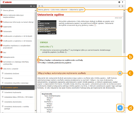 Kliknij, aby ustawić parametry w celu określenia sposobu wyświetlania instrukcji Instrukcja e-Manual, np. rozmiaru znaków i układu.