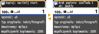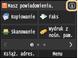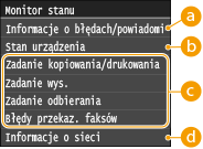 zostanie wyświetlony ekran umożliwiający sprawdzenie stanu drukowanych, wysyłanych lub otrzymywanych dokumentów, a także stanu urządzenia (np. ilości toneru w zasobniku) oraz ustawień sieciowych (np. adres IP urządzenia).