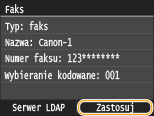 ![]() Jeśli po dotknięciu przycisku <Rozpocz. wysz.> pojawia się ekran uwierzytelnienia, wprowadź nazwę użytkownika i hasło zapisane na serwerze LDAP i dotknij przycisku <Zastosuj>. Rejestracja serwera LDAP