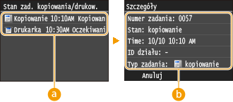 ![]() <Rejestr zadań kopiowania>Wyświetlanie listy dokumentów, które zostały skopiowane. Komunikat <OK> jest wyświetlany po pomyślnym skopiowaniu dokumentu. Jeżeli natomiast kopiowanie dokumentu nie powiedzie się, ponieważ zostało anulowane lub wystąpił błąd, na ekranie pojawi się komunikat <Błąd>.