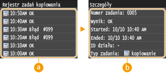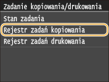 Gdy dla opcji <Wyświetlanie rejestru zadań> wybrano ustawienie <Wyłącz>, nie można sprawdzić dziennika zadania kopiowania. Wyświetlanie rejestru zadań