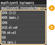 Istnieje możliwość powiększania lub zmniejszania kopii poprzez użycie wcześniej ustawionego współczynnika kopiowania, takiego jak <A5->A4>, lub ustawienie niestandardowego współczynnika kopiowania (z dokładnością do 1%).