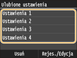 Aby usunąć zapisane ustawienie, dotknij <Kopiowanie>  <Ulubione ustawienia>  <Usuń>  Wybierz ustawienia  <Tak>  <Tak>.
