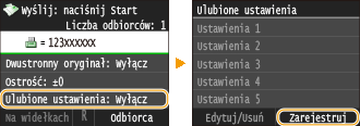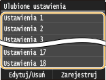 Aby edytować lub usunąć zapisane ustawienia, przejdź do <Faks>  <Ulubione ustawienia>  <Edytuj/Usuń>  <Edytuj> lub <Usuń> i wykonaj przedstawione poniżej kroki.