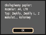 Upewnić się, że na ekranie jest wyświetlany odpowiedni format i typ papieru, a następnie dotknąć przycisku <OK>.