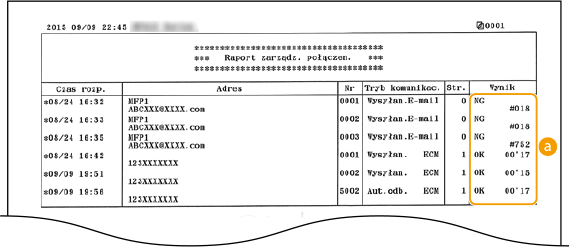 Jeśli wyświetlany jest kod błędu). W przypadku wiadomości e-mail Raport zarządzania połączeniami zawiera wynik transmisji między urządzeniem a serwerem pocztowym, nie między urządzeniem a adresem odbiorcy.