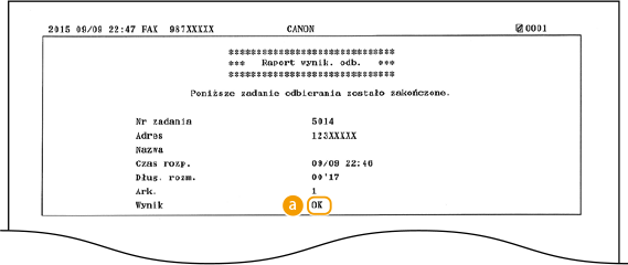Dzienniki otrzymanych faksów lub I-faksów można sprawdzić, drukując Raport wyników RX. Raport można drukować każdorazowo po zakończeniu transmisji lub tylko w przypadku wystąpienia błędu odbierania.