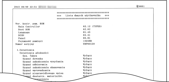 <Lista danych użytkownika> nie zawiera list ustawień: <Ustawienia sieciowe> ani <Ustawienia zarządzania systemem>, a także części listy ustawień <Ustawienia faksu>. Aby sprawdzić wszystkie ustawienia, w tym: <Ustawienia sieciowe> oraz <Ustawienia zarządzania systemem>, należy wydrukować listę <Lista danych menedżera systemu>.