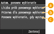 Konfiguracja ustawień automatycznego ponownego wybierania, funkcji umożliwiającej automatyczne ponowne wybranie numeru faksu po kilku minutach, jeśli pierwsza próba kończy się niepowodzeniem, ponieważ linia jest zajęta. Istnieje możliwość ustawienia liczby ponownych wybrań i przerwy między kolejnymi wybraniami.