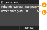 Wybór miejsca, w którym na wysyłanym faksie umieszczona zastanie informacja o identyfikatorze terminalu. Można wybrać opcję <Wewnętrzny obszar obrazu>, aby wydrukować tę informację wewnątrz obszaru obrazu lub opcję <Zewnętrzny obszar obrazu>, aby wydrukować ją poza jego obrębem.