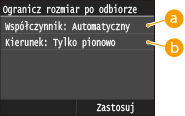 Konfiguracja ustawień pomniejszania rozmiaru odebranego dokumentu. Możliwe jest wybranie współczynnika automatycznego pomniejszenia, dzięki któremu odbierane dokumenty będą pomniejszane do rozmiaru dopasowanego do załadowanego papieru. Można także wybrać współczynnik z listy.