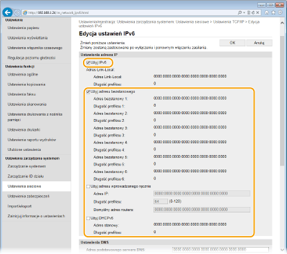 Adresy IPv6 urządzenia można skonfigurować za pomocą Zdalnego interfejsu użytkownika. Przed rozpoczęciem konfiguracji adresów IPv6 należy sprawdzić ustawienia adresu IPv4 (Wyświetlanie ustawień IPv4). Aby korzystać z adresów IPv6, należy poprawnie skonfigurować ustawienia adresu IPv4. Funkcja skanowania używająca sterownika skanera lub program MF Scan Utility jest niedostępna w środowisku IPv6. Urządzenie może korzystać z maksymalnie dziewięciu wymienionych niżej adresów IPv6: