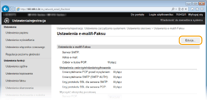 Za pomocą Zdalnego interfejsu użytkownika można przed wysłaniem wiadomości e-mail lub I-faksu skonfigurować szczegółowe ustawienia wysyłania i odbierania, w tym ustawienia urządzenia do wysyłania i odbierania I-faksów, ustawienia uwierzytelniania POP oraz ustawienia szyfrowania komunikacji. Wymagane ustawienia należy uzyskać od dostawcy usług lub administratora sieci.