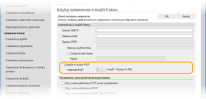 Ustawia odstęp czasu (w minutach) między automatycznymi połączeniami z serwerem POP3. Jeśli na serwerze znajdują się dokumenty I-faks, zostaną automatycznie pobrane i wydrukowane.