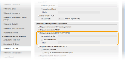 W przypadku skonfigurowania uwierzytelniania SMTP (SMTP AUTH) w momencie wysłania wiadomości e-mail lub I-faksu będzie przeprowadzana identyfikacja użytkownika w oparciu o nazwę użytkownika i hasło.