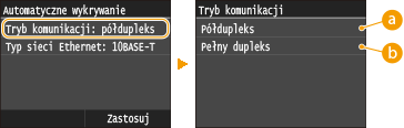 , dotknij <Półdupleks> albo <Pełny dupleks>.![]() <Półdupleks>Naprzemiennie wysyła i pobiera dane komunikacyjne. Opcję tę należy wybrać, gdy urządzenie jest podłączone do urządzenia sieciowego w trybie półdupleks.