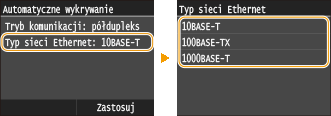 , aby wybrać typ sieci Ethernet.![]() ![]() Gdy dla opcji <Tryb komunikacji> wybrano ustawienie <Półdupleks>, opcja <1000BASE-T> jest niedostępna.