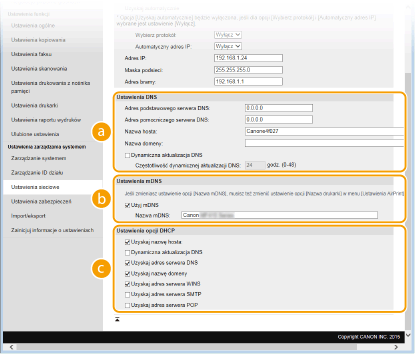 Wprowadzony w programie Bonjour protokół mDNS (system DNS w trybie multiemisji) kojarzy nazwę hosta z adresem IP bez korzystania z usługi DNS. Aby włączyć protokół mDNS, należy zaznaczyć to pole i wprowadzić nazwę mDNS w polu tekstowym [Nazwa mDNS]. [Ustawienia opcji DHCP][Uzyskaj nazwę hosta]