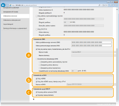 To pole tekstowe należy zaznaczyć, aby rekordy DNS były dynamicznie aktualizowane po każdej zmianie adresu IP urządzenia. Czas odstępów między aktualizacjami można określić, wprowadzając czas w godzinach w polu tekstowym [Częstotliwość dynamicznej aktualizacji DNS]. [Ustawienia mDNS][Użyj mDNS]