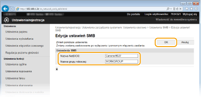 Blok komunikatów serwera (SMB) to protokół umożliwiający udostępnianie zasobów, takich jak pliki i drukarki, kilku urządzeniom w sieci. Urządzenie używa protokołu SMB do przechowywania zeskanowanych dokumentów w folderze udostępnionym. W zależności od sieci konieczne może być określenie nazwy NetBIOS i nazwy grupy roboczej.