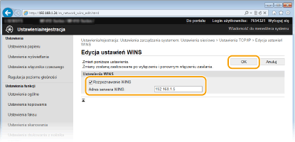 Jeśli adres IP serwera WINS jest uzyskiwany z serwera DHCP, jest on nadrzędny w stosunku do adresu IP wprowadzonego w polu tekstowym [Adres serwera WINS].