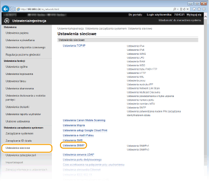 Ustawienia SNMP można włączyć lub wyłączyć za pomocą przycisku <Menu>. Ustawienia SNMP