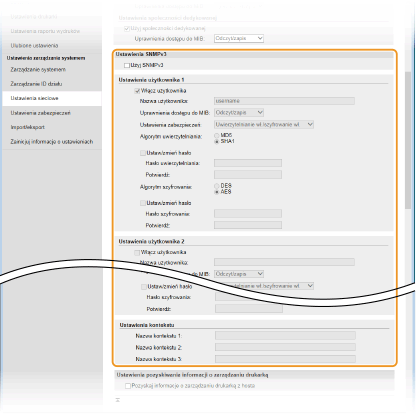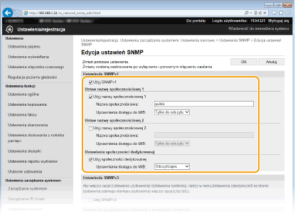 Jeśli włączone są obie wersje protokołu SNMP, zalecane jest wybranie w ustawieniach uprawnień dostępu do obiektów menedżera MIB dla protokołu SNMPv1 opcji [Tylko do odczytu]. Uprawnienia dostępu do obiektów menedżera MIB dla protokołów SNMPv1 i SNMPv3 można ustalać oddzielnie (a także osobno dla każdego użytkownika w przypadku protokołu SNMPv3). Wybranie opcji [Odczyt/zapis] (uprawnienie pełnego dostępu) dla protokołu SNMPv1 anuluje wydajne funkcje zabezpieczeń protokołu SNMPv3, ponieważ większością ustawień urządzenia można wtedy zarządzać za pomocą protokołu SNMPv1.