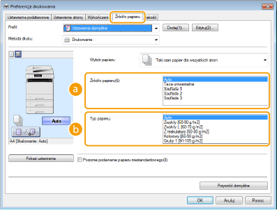 Źródło papieru zostanie wybrane automatycznie na podstawie wybranego formatu i typu papieru oraz ustawień urządzenia.
