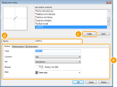 Kliknięcie każdej z zakładek umożliwia określenie tekstu, koloru oraz miejsca nadruku znaku wodnego. Więcej informacji znajduje się w menu [Pomoc] w oknie sterownika drukarki.