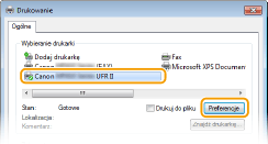 Wybierz sterownik drukarki dla urządzenia, po czym kliknij pozycję [Preferencje] lub [Właściwości].