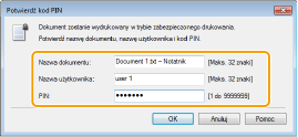 Wprowadzić wartości [Nazwa dokumentu], [Nazwa użytkownika] oraz [PIN], a następnie kliknąć opcję [OK].