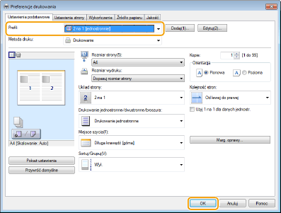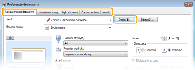 Określanie kombinacji ustawień, jak np. drukowanie „1-stronne w orientacji poziomej na papierze w formacie A4” przy każdym drukowaniu, może być czasochłonne. Jeśli często używane kombinacje ustawień wydruku zostaną zarejestrowane jako „profile”, skonfigurowanie ustawień wydruku będzie wymagało jedynie wybrania profilu z listy. W tej sekcji opisany został sposób rejestracji profili i drukowania za ich pomocą.